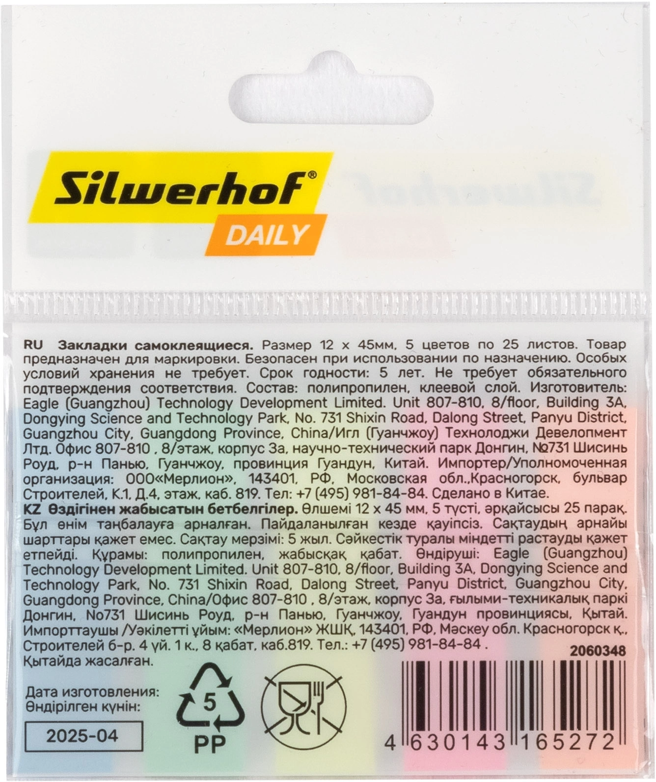 Закладки самокл. пластиковые Silwerhof 45x12мм Daily 5цв.в упак. 25лист (упаковка 24 шт.)