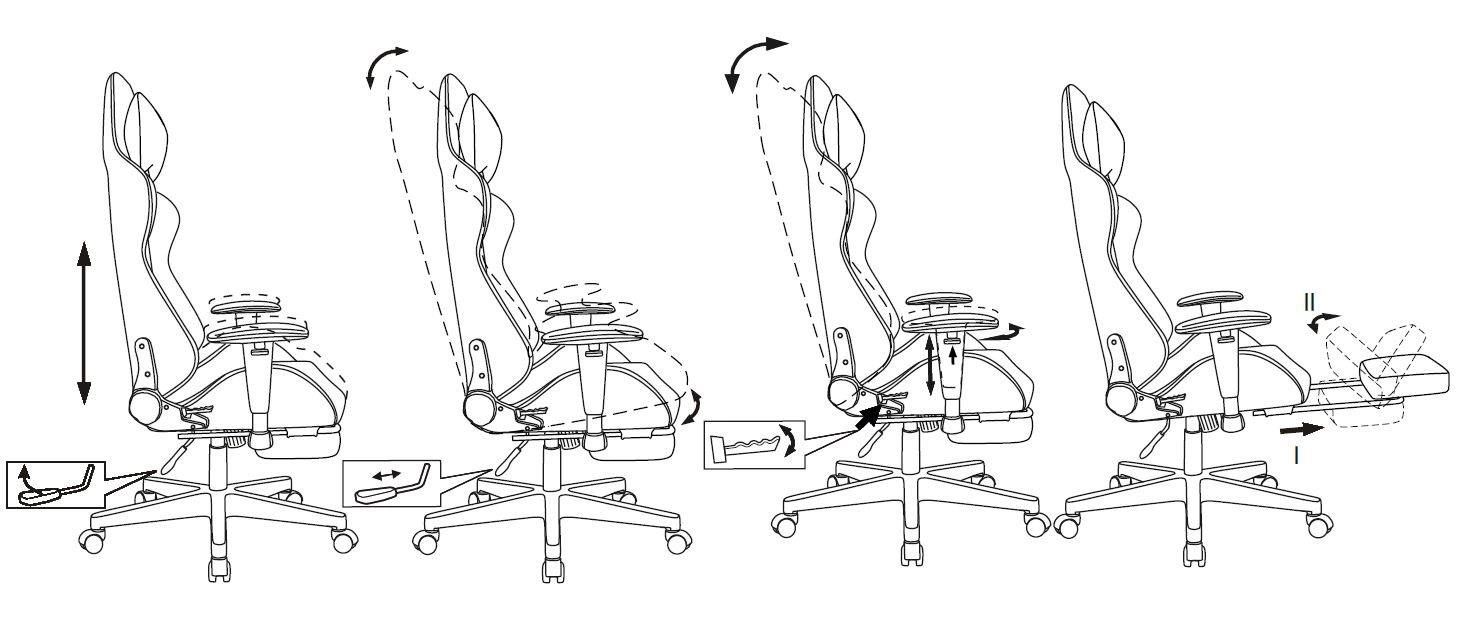 высоты (газлифт), высоты подголовника, глубины сиденья, жесткости качания, положения подлокотников