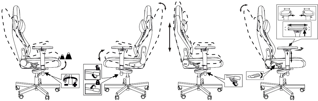 высоты (газлифт), высоты подголовника, жесткости качания, положения подлокотников