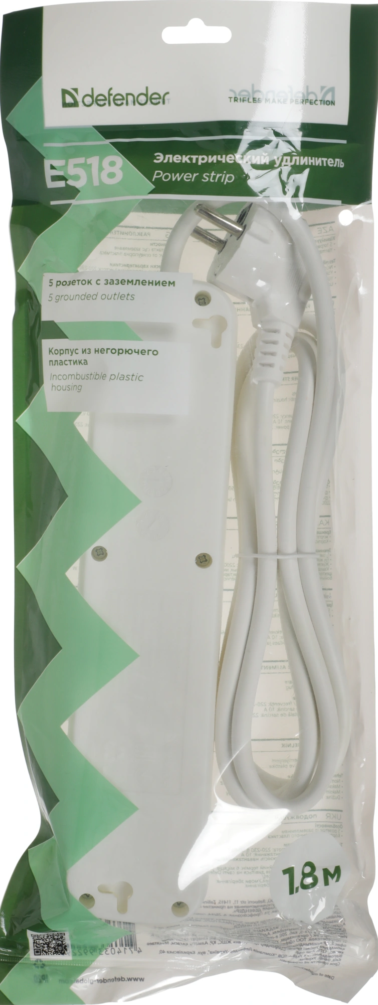 Сетевой удлинитель Defender E518 1.8м (5 розеток) белый (пакет ПЭ) (99229)