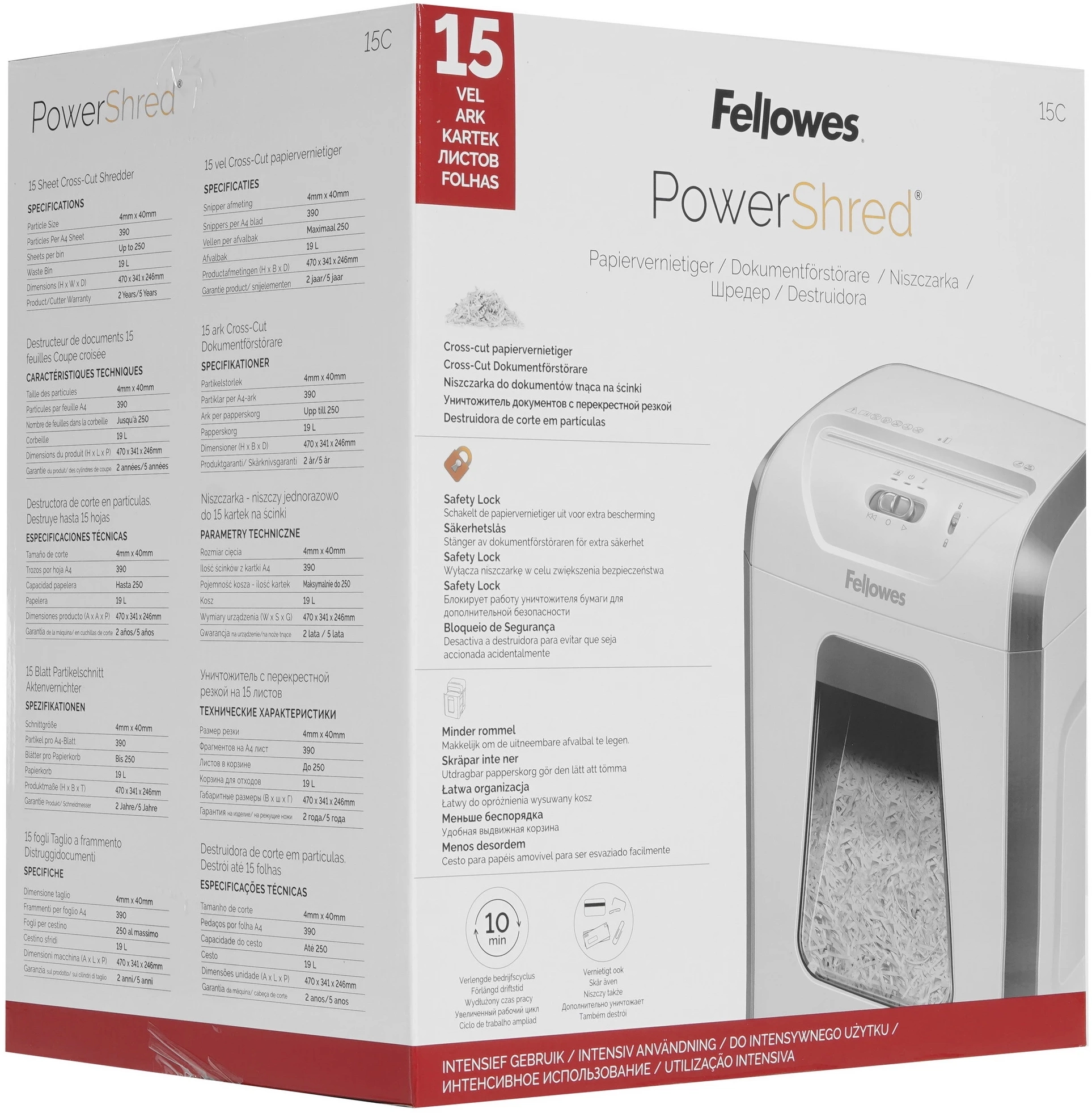 Шредер Fellowes PowerShred 15С белый (секр.P-4) фрагменты 15лист. 19лтр. скрепки скобы пл.карты (100017466)