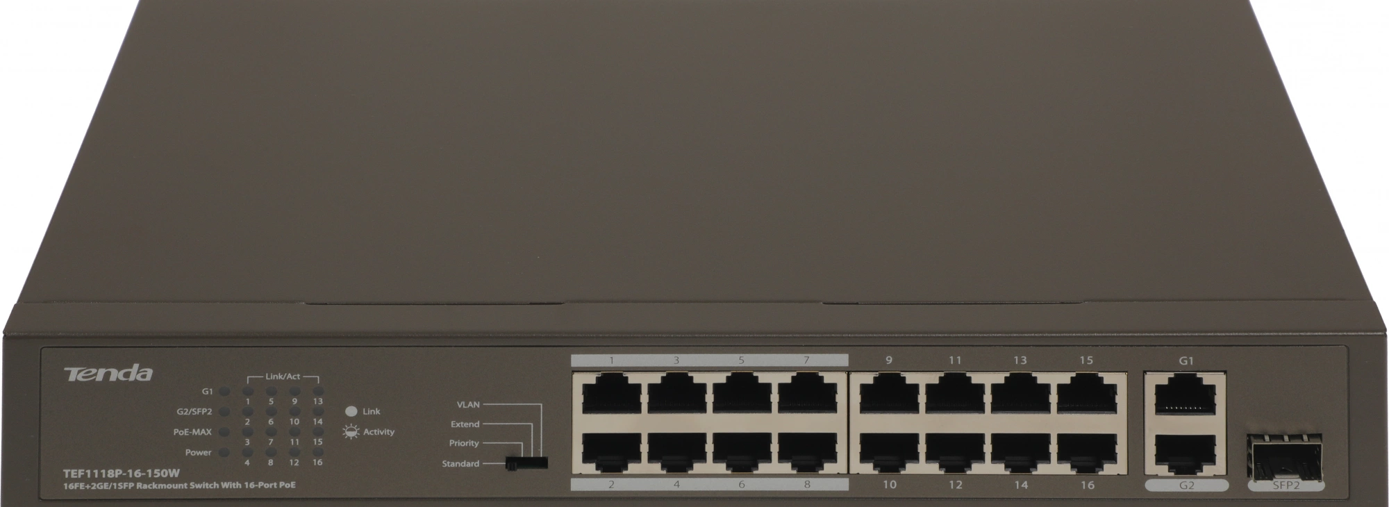 Коммутатор Tenda TEF1118P-16-150W (L2) 16x100Мбит/с 2x1Гбит/с 1SFP 16PoE 130W неуправляемый (TEF1118P-16-150W)