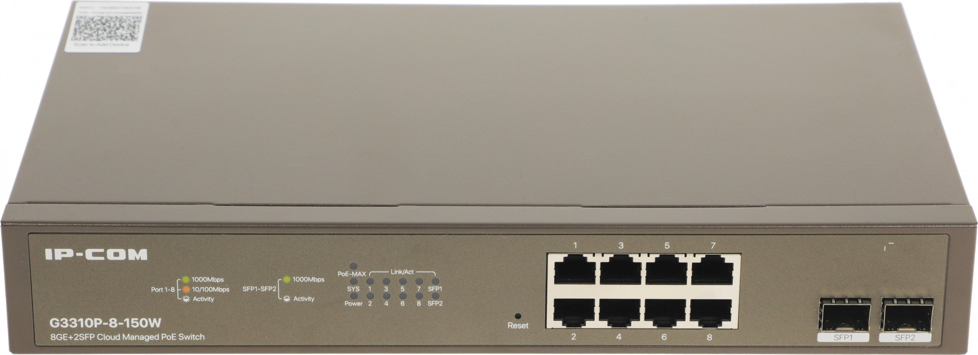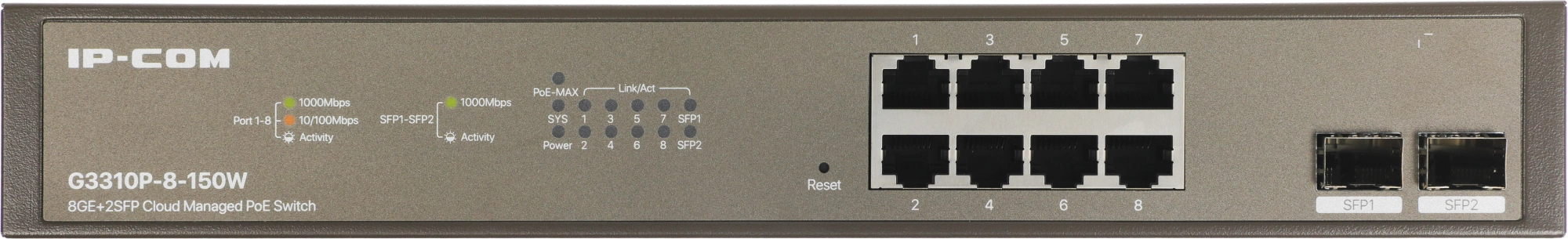 Коммутатор IP-Com G3310P-8-150W (L2) 8x1Гбит/с 2xКомбо(1000BASE-T/SFP) 2SFP 8PoE 130W управляемый (G3310P-8-150W)