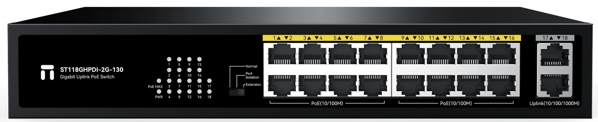 Коммутатор Netis ST118GHPDI-2G-130 (L2) 16x100Мбит/с 2x1Гбит/с 16PoE 130W неуправляемый (ST118GHPDI-2G-130)