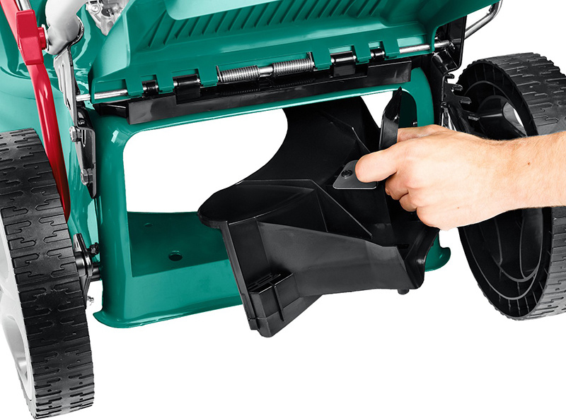 Газонокосилка, рукоятка, травосборник, ключ, зажим - 2 шт., вставка для мульчирования, кожух направляющий, руководство по эксплуатации.
