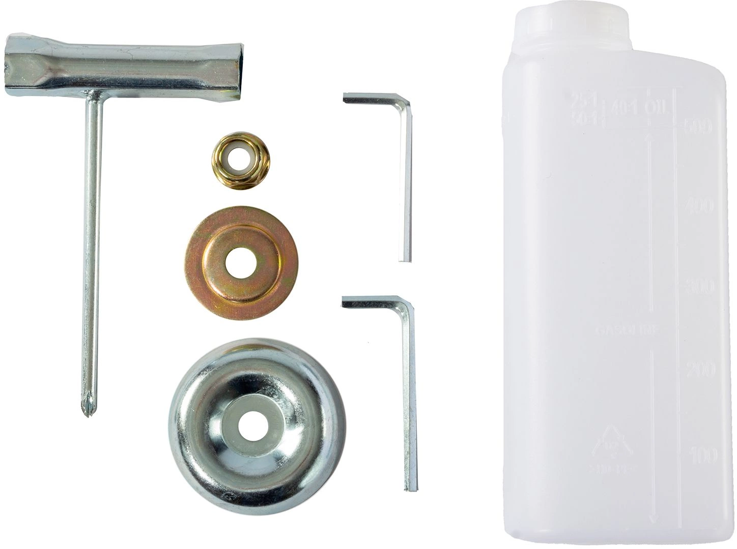 Триммер бензиновый, Защитный щиток, Наплечный ремень, Шпулька с леской, Пильный диск 40 зубьев, Ёмкость для приготовления топливной смеси, Шестигранный ключ - 2шт., Пластиковые стяжки - 2шт., Свечной ключ, Инструкция