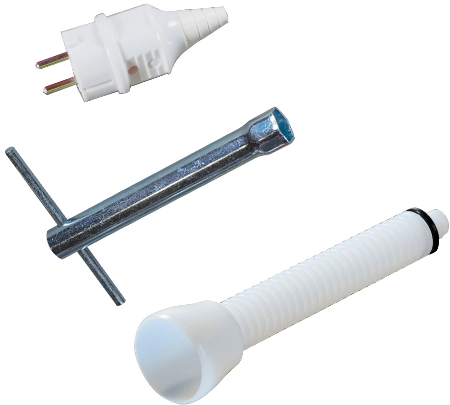 Генератор, штепсельная вилка 220В/16А, свечной ключ, емкость для заливки масла, комплект проводов для DC, отвертка, инструкция пользователя.