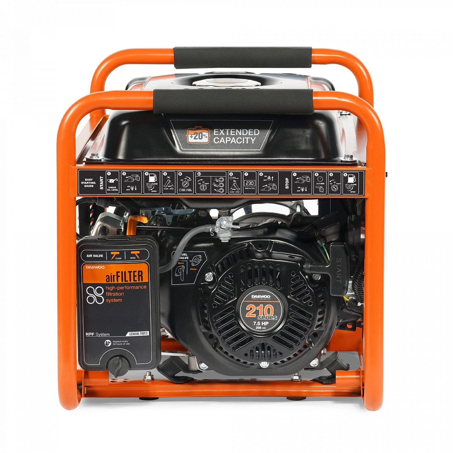 Профессиональный двигатель DAEWOO, увеличенный топливный бак 18 л, быстрый запуск, многофункциональный дисплей, умная защита от перегрузок, запуск от ключа, датчик уровня масла, низкий уровень шума, прочная рама, транспортный комплект (опция), медный альтернатор, встроенное зарядное устройство 12В