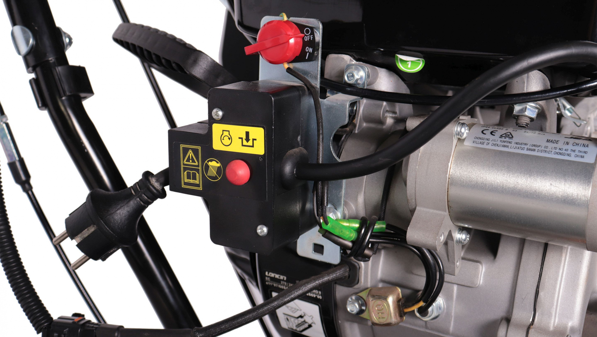 Электростартер, фара, обогрев рукояток. Обрезиненные рукоятки, блокировка рычага включения шнеков. Регулировка положения выброса снега и положения желоба производится на панели.