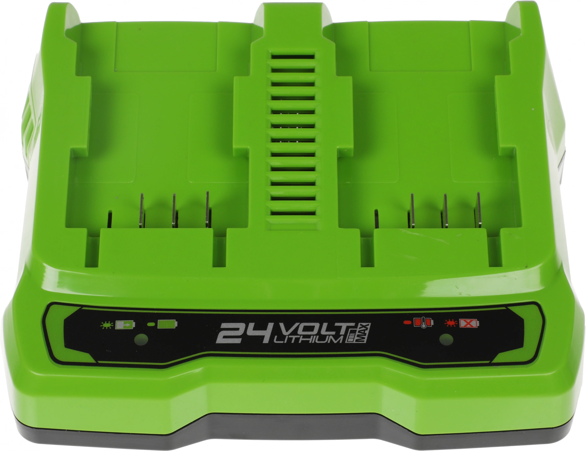 Зарядное устройство на 2 слота Greenworks G24X2UC2 24V 2931907 — применяется для синхронной/параллельной зарядки двух аккумуляторов напряжением 24 вольт и емкостью 2А/ч и 4 А/ч. В плату зарядки встроен чип защиты от перезарядки и при достижении уровня заряда 100% устройство отключается.