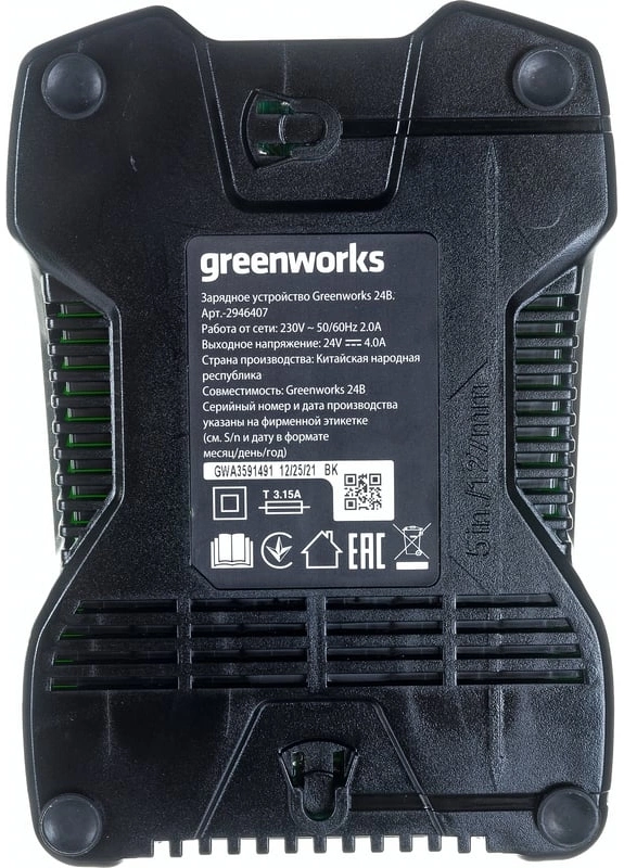 заряжает 2 Ач и 4 Ач аккумуляторы серии Greenworks 24V