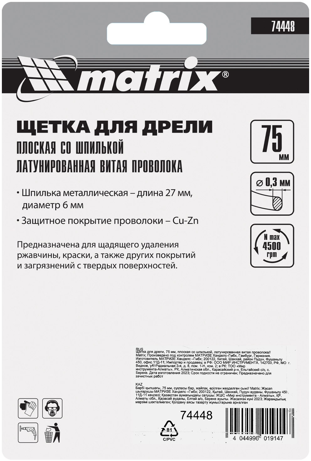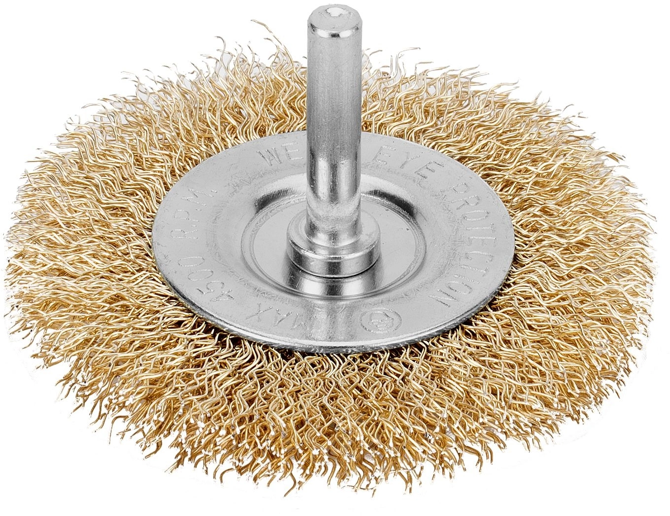 Плоская щетка для дрели Matrix 74448 диаметром 75 мм, со шпилькой, с щетиной из латунированной витой проволоки, предназначена для бережной очистки металлических, деревянных, пластиковых поверхностей от загрязнений, старых лакокрасочных материалов и ржавчины.