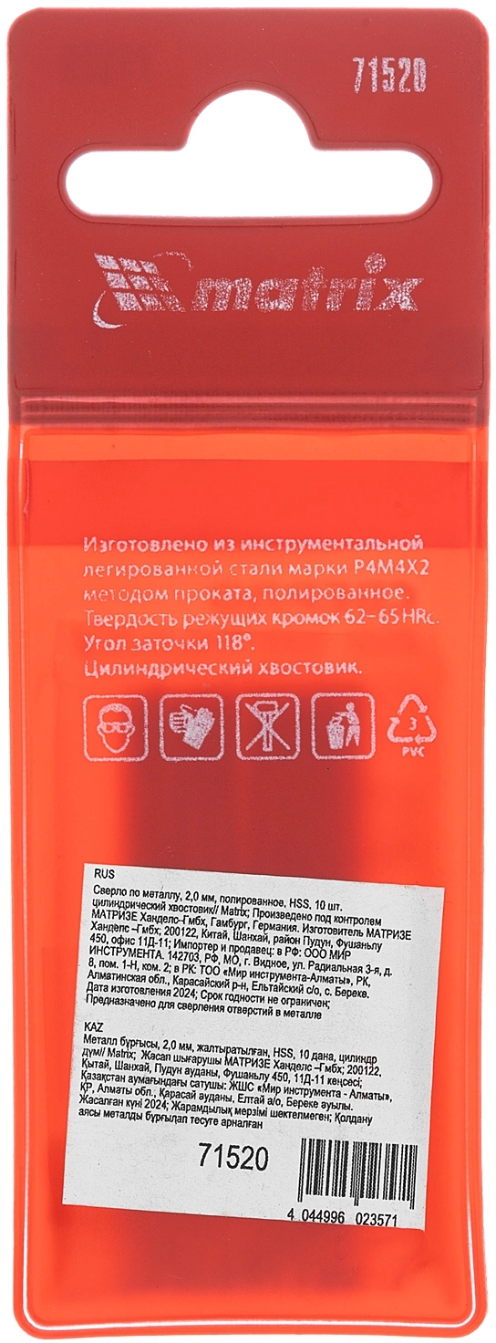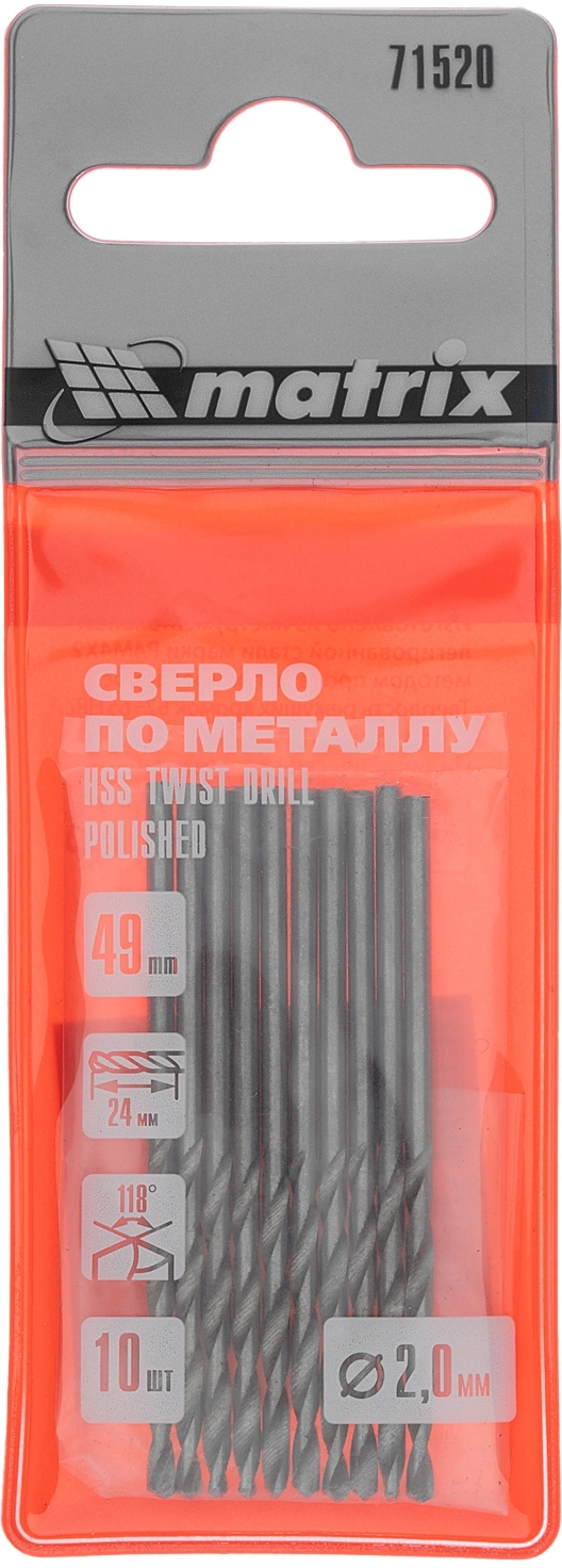 Сверло Matrix 71520 по металлу Д=2мм Дл=49мм (10пред.) для дрелей (71520)