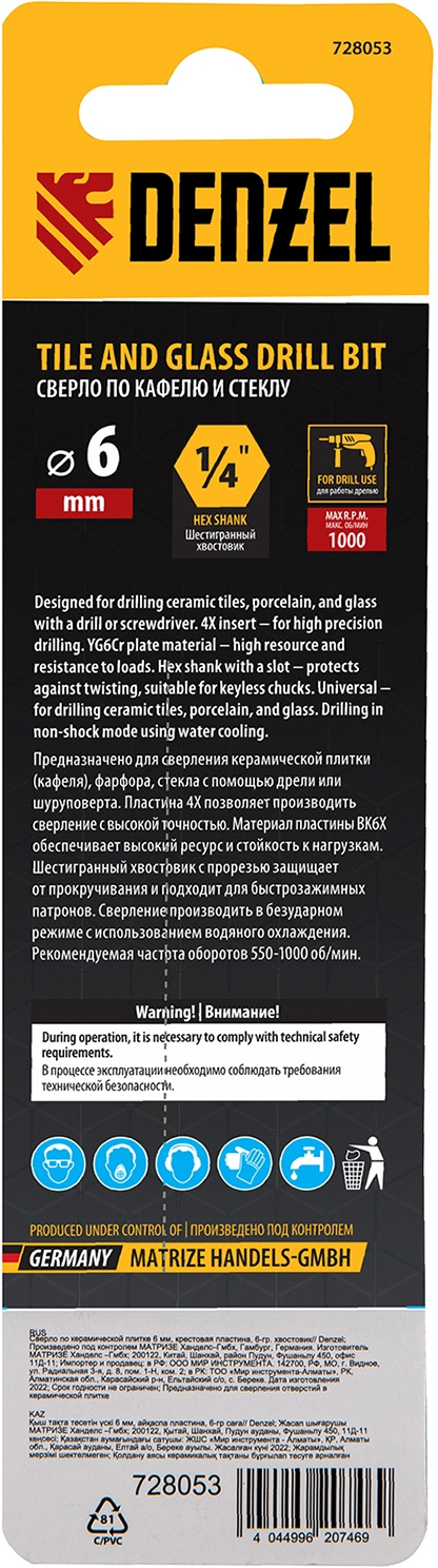 Сверло Denzel 728053 по плитке Д=6мм (1пред.) для дрелей (728053)