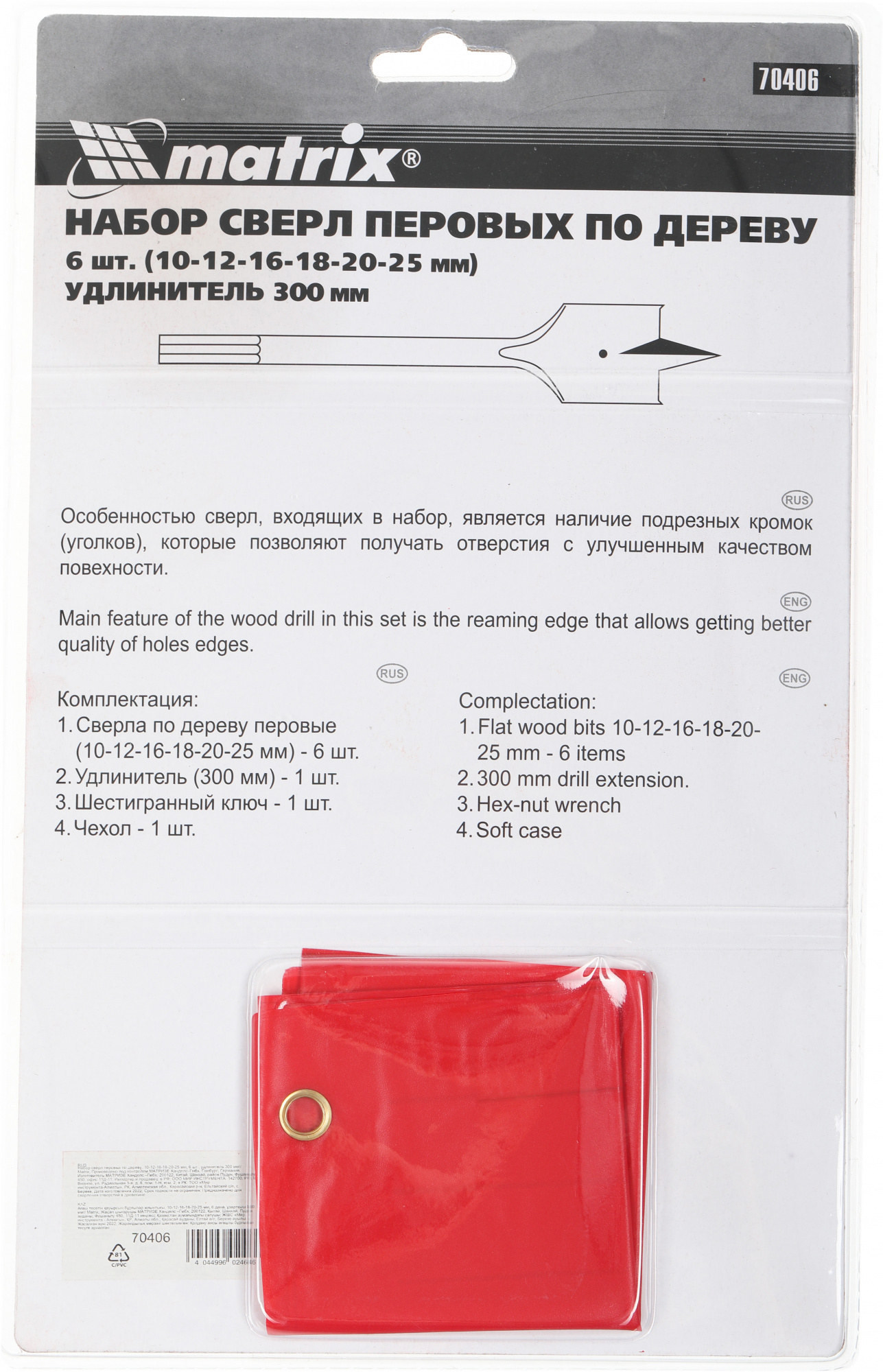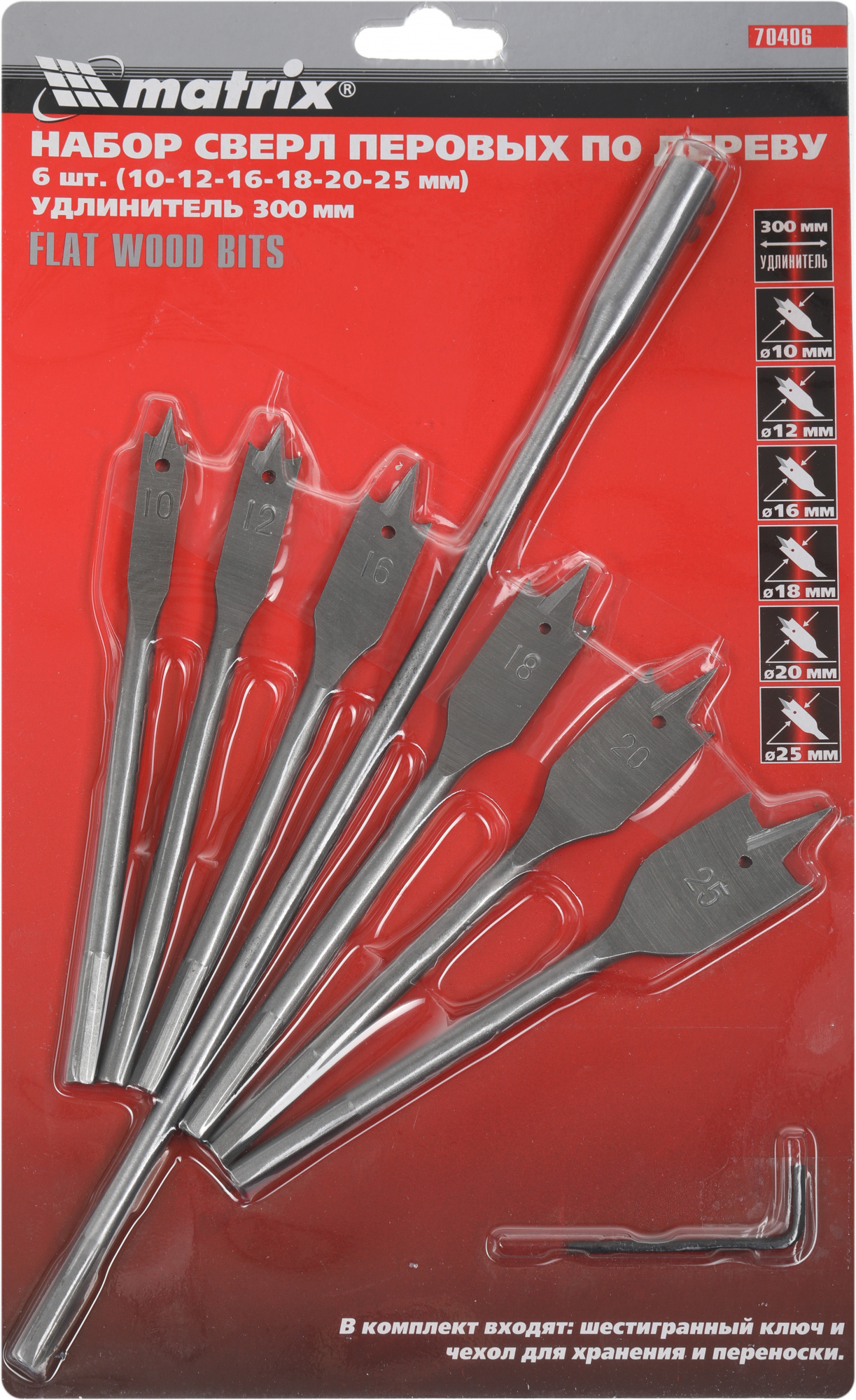 Перовые сверла изготовлены из углеродистой стали. Твердость режущих кромок 45–54 HRC. Набор 70406 дополнительно комплектуется удлинителем 300 мм. Хвостовики имеют шестигранную форму, что предотвращает поворот сверла. Центрирующее острие исключает необходимость в предварительном засверливании.