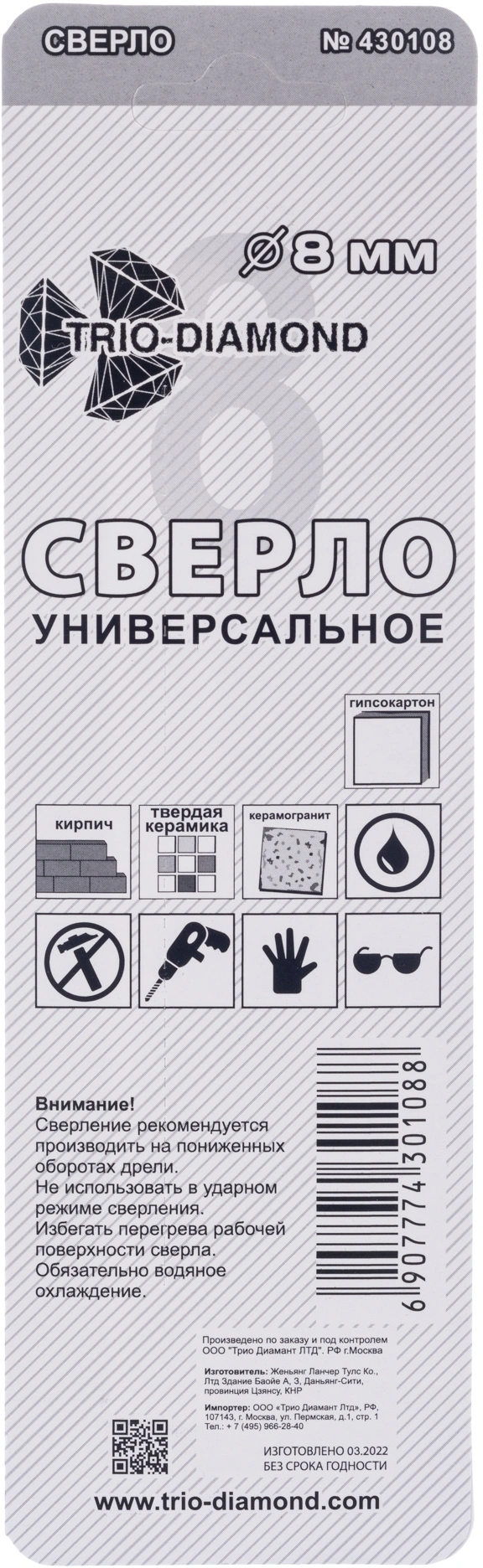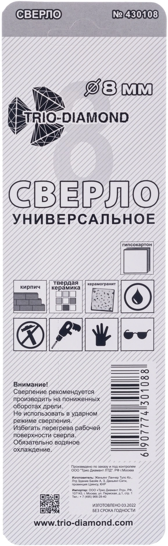 Сверло Trio-Diamond 430108 по керамогр/плит/кирп Д=8мм для дрелей/перфораторов (430108)