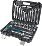 набор, включающий ассортимент сборного слесарно-монтажного инструмента системы 1/2"DR, состоящий из 10 торцевых шестигранных головок в рабочем диапазоне от 10 до 19 мм, трещоточной рукоятки 72 зубца, с пластиковой ручкой и быстрым сбросом и удлинителя L= 125 мм.