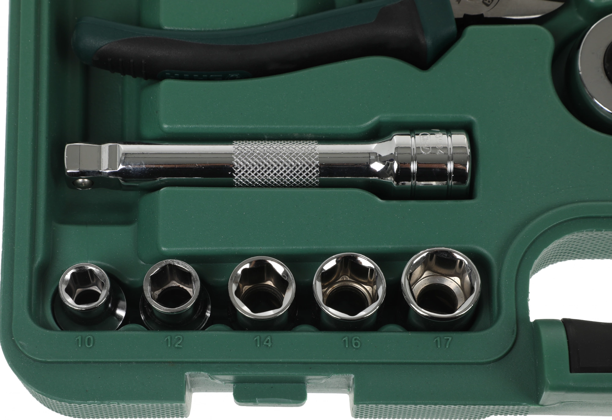 Головки торцовые 1/2" 6 граней: 10, 12, 14, 16, 17, 19, 21, 22, 24мм. Ключи комбинированные: 8, 10, 12, 14, 16, 17, 19мм. Ключ трещеточный 1/2". Удлинитель 1/2" 125мм. Рычаг угловой 1/2" 260мм. Отвертки Phillips: РН2х100мм, РH2х150мм. Отвертки шлицевые: 6х100мм, 6х150мм. Тонкогубцы 150мм.