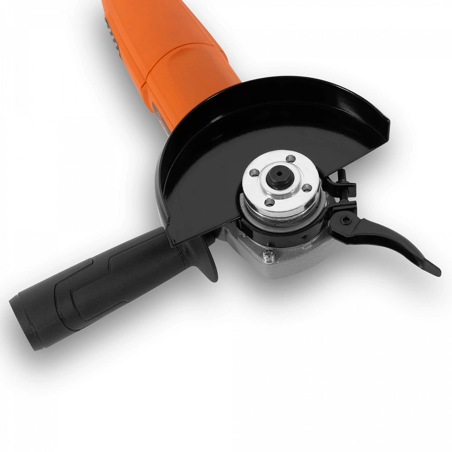 Усиленный редуктор из магниевого сплава. Блокировка шпинделя – для простоты замены диска. Трехпозиционная рукоятка. Изменение положения основной рукоятки. Плавный пуск. Угольные щетки. Защитный кожух.