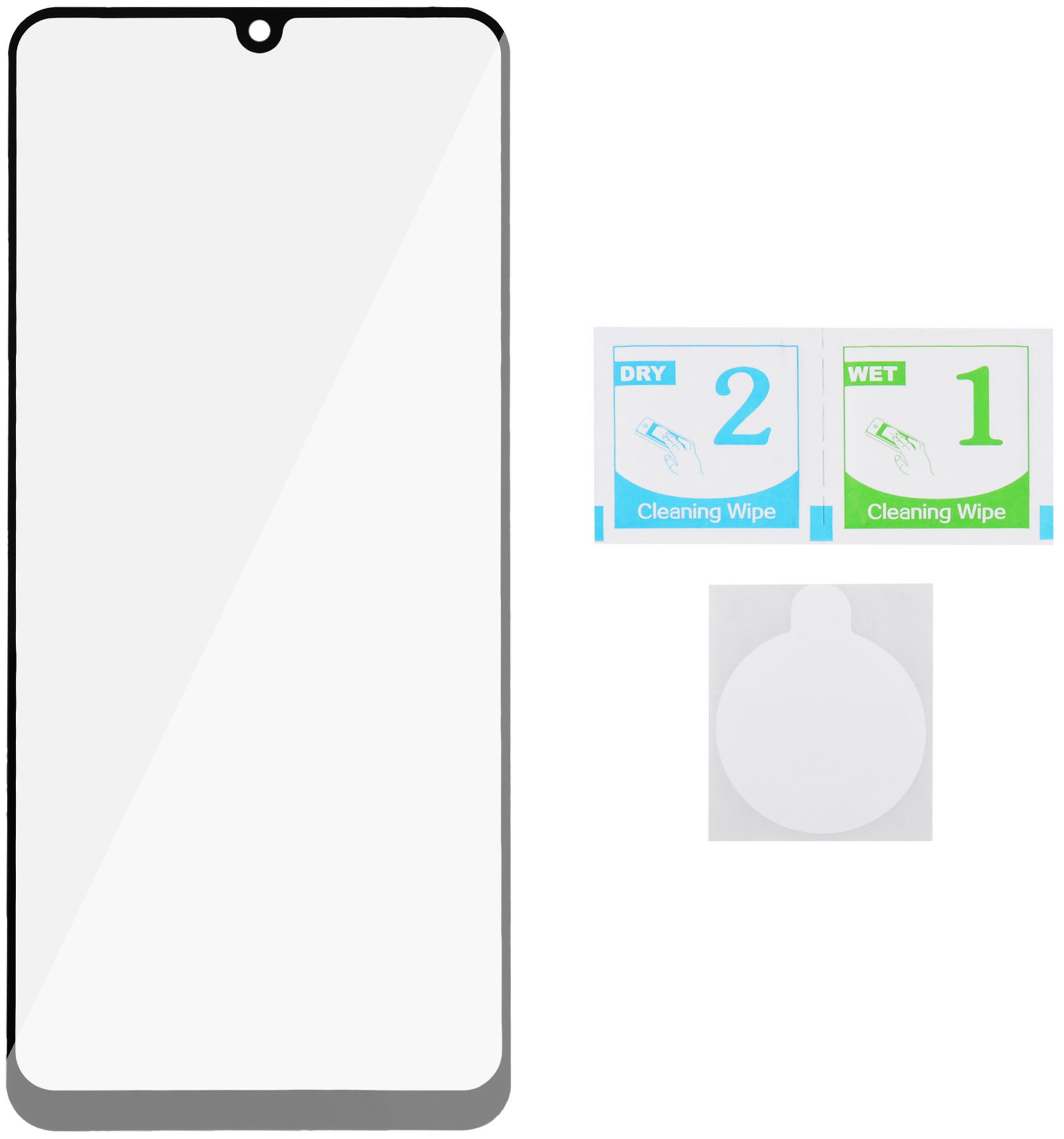 Стекло закаленное – 1 шт. Стикер для удаления пыли – 1 шт. Салфетка – 2 шт. Инструкция.