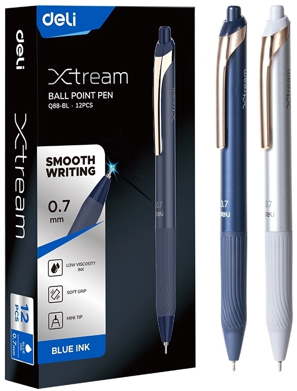 Ручка шариков. автоматическая Deli EQ88-BL d=0.7мм син. черн. карт.уп. игловидный пиш. наконечник резин. манжета чернила пониженной вязкости (EQ88-BL) (упаковка 12 шт.)