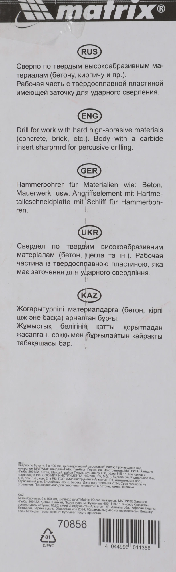 Сверло Matrix 70856 по бетону Д=6мм Дл=100мм (1пред.) для дрелей (70856)
