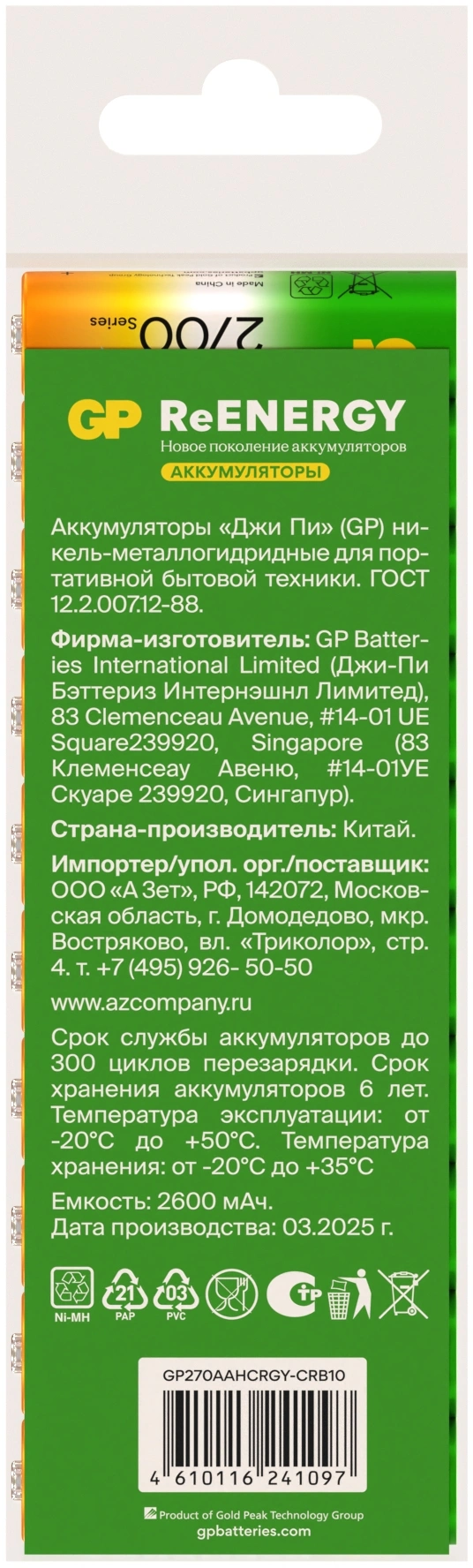 Аккумулятор GP 270AAHCRGY-CRB10 AA NiMH 2700mAh (10шт) спайка (GP 270AAHCRGY-CRB10 /200)