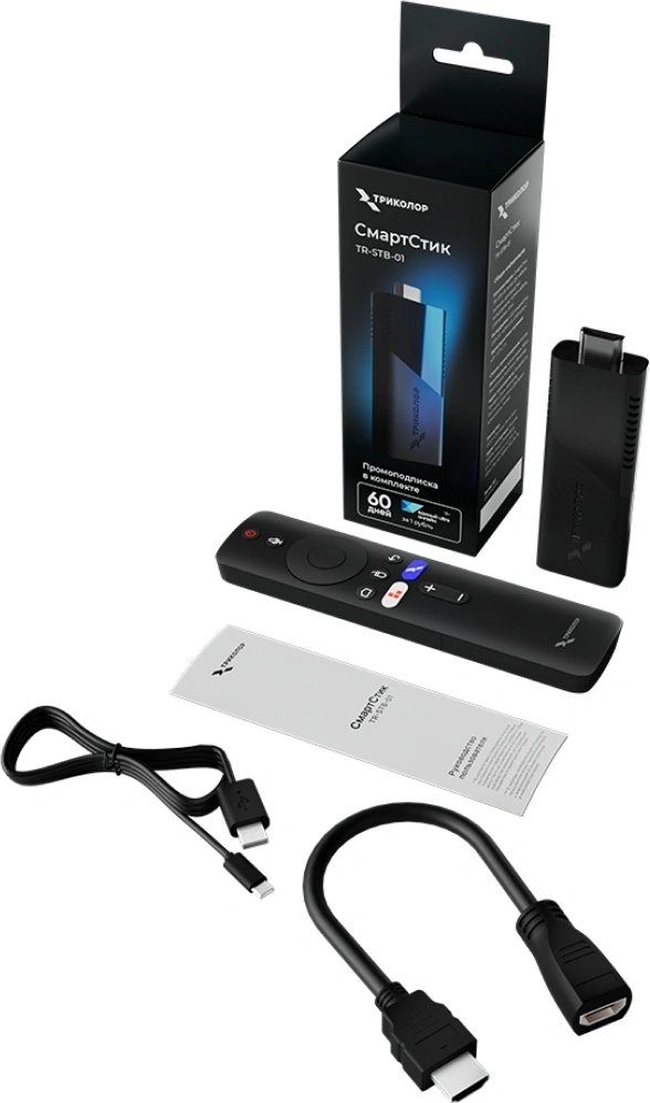 Триколор СмартСтик • Пульт дистанционного управления • 2x батарейки ААА • Руководство пользователя • HDMI-кабель • Кабель питания (USB – USB type C) • Вкладыш с промо-подпиской • Упаковка в новом фирменном дизайне «Триколор»