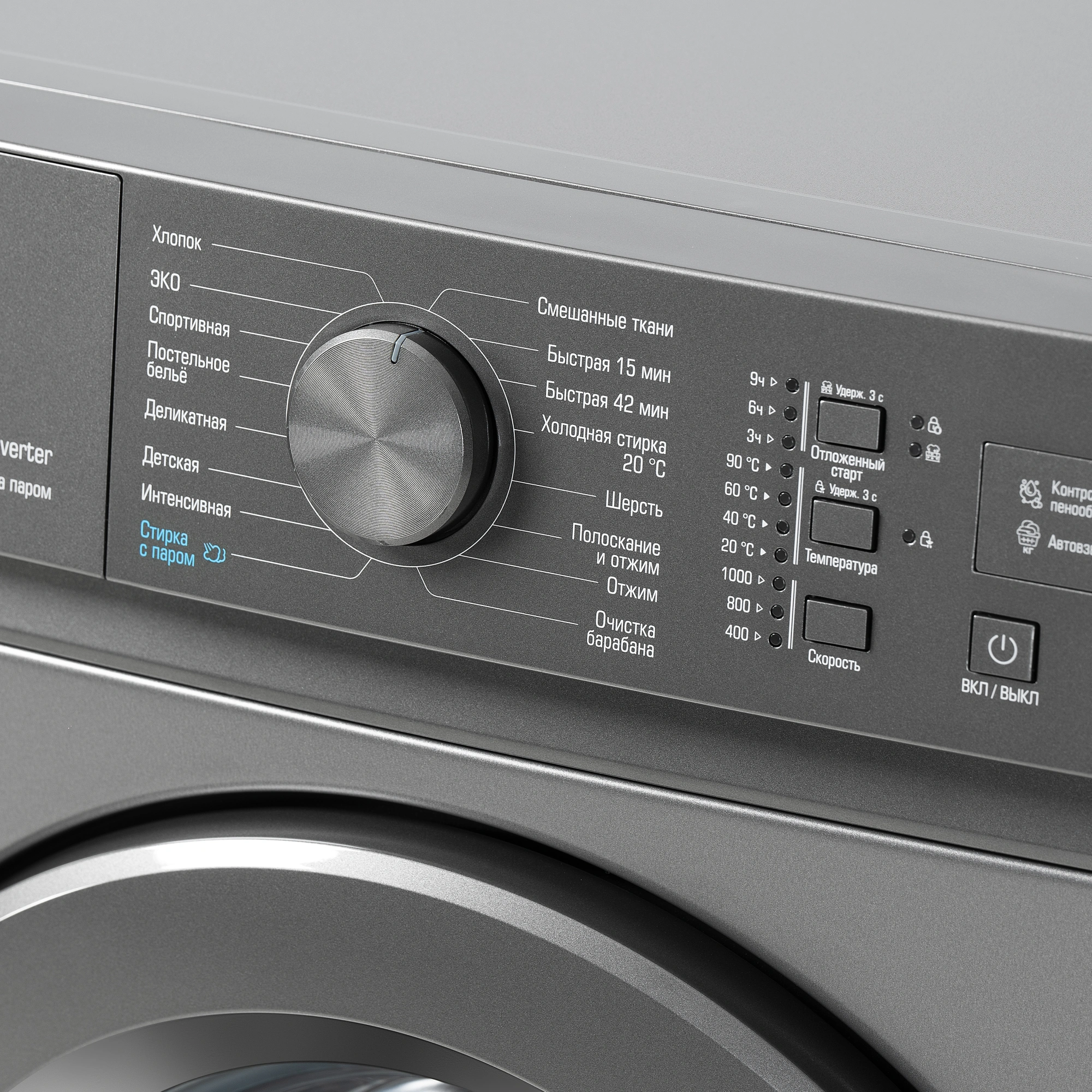 Хлопок, Деликатная, Интенсивная, Смешанные ткани, Быстрая 42/15 мин, Холодная стирка 20°С, Отжим, Шерсть, Полоскание и отжим, Очистка барабана, ЭКО, Детская, Постельное белье, Спортивная, Стирка с паром.