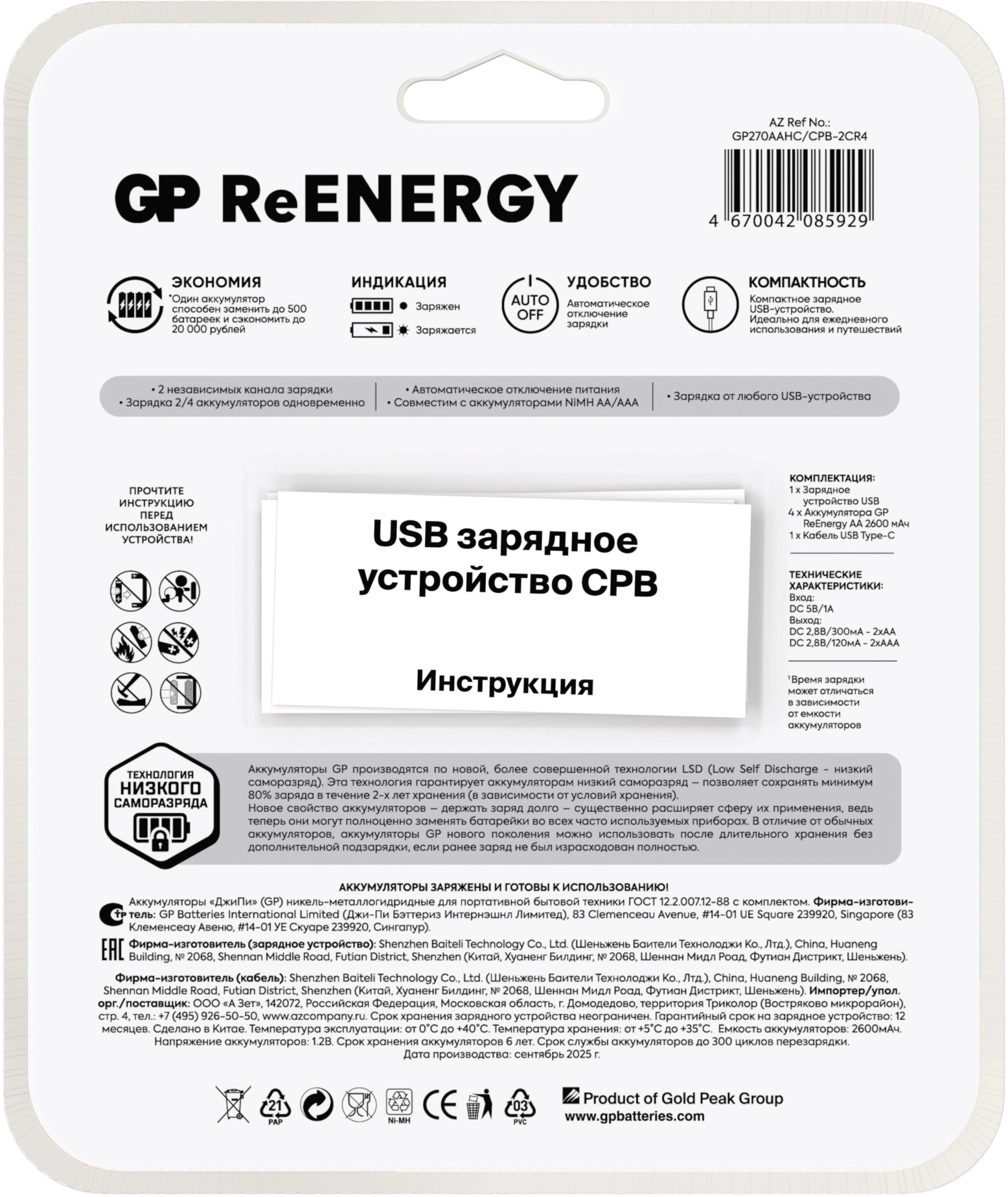 Аккумулятор + зарядное устройство GP 270AAHC/CPB-2CR4 AA NiMH 2700mAh (4шт) блистер (GP 270AAHC/CPB-2CR4 12/48)