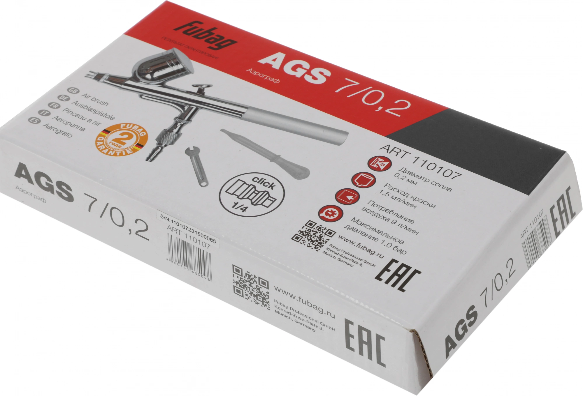 Аэрограф Fubag AGS7/0.2 с удобной ручкой. Сопло маленького диаметра (0,2 мм.) отлично подходит для тончайшего нанесения краски и рисования мелких элементов. Высокочувствительный регулятор подачи воздуха и краски.