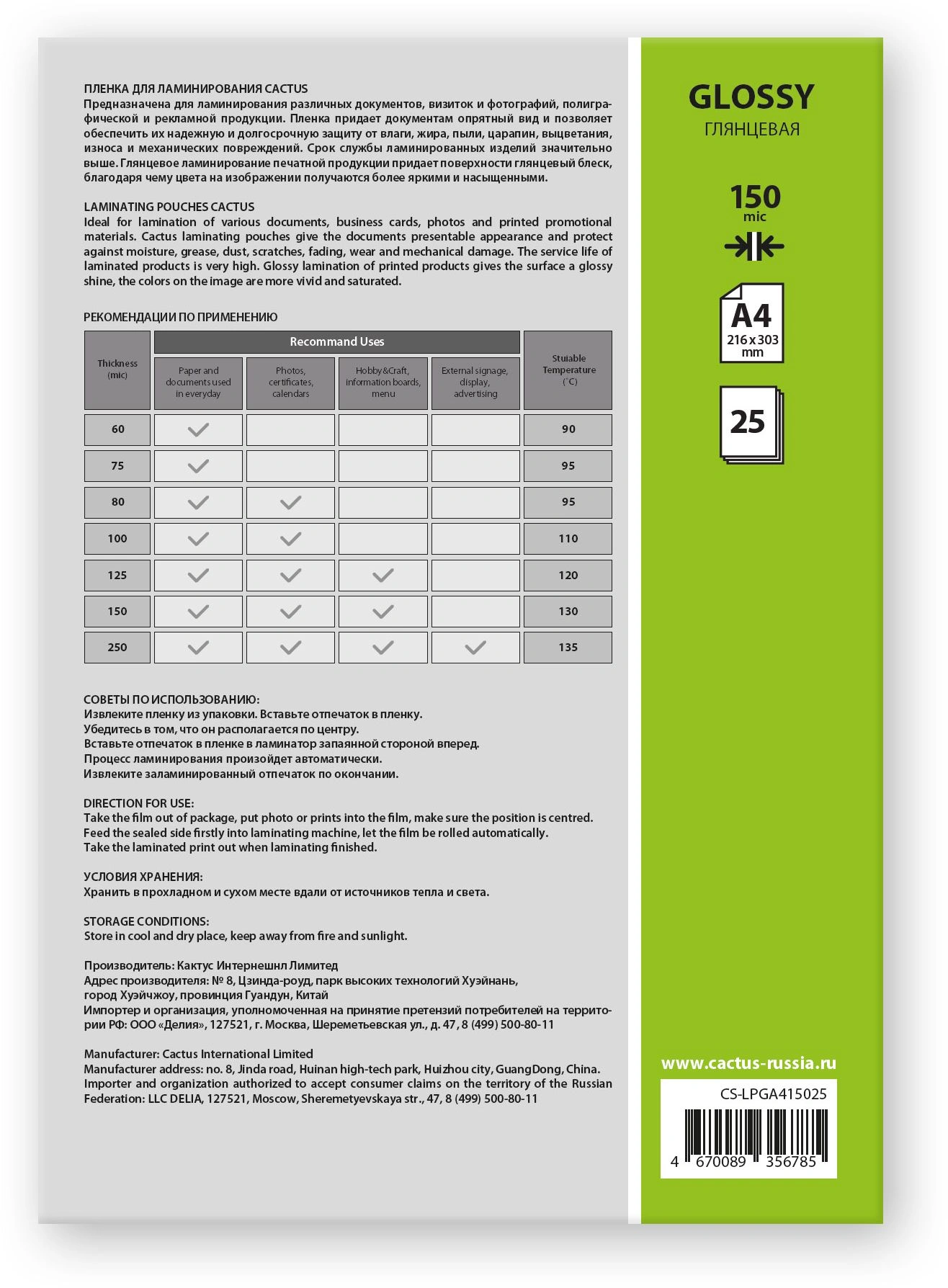 Пленка для ламинирования Cactus 150мкм A4 (25шт) глянцевая 216x303мм CS-LPGА415025 (CS-LPGА415025)