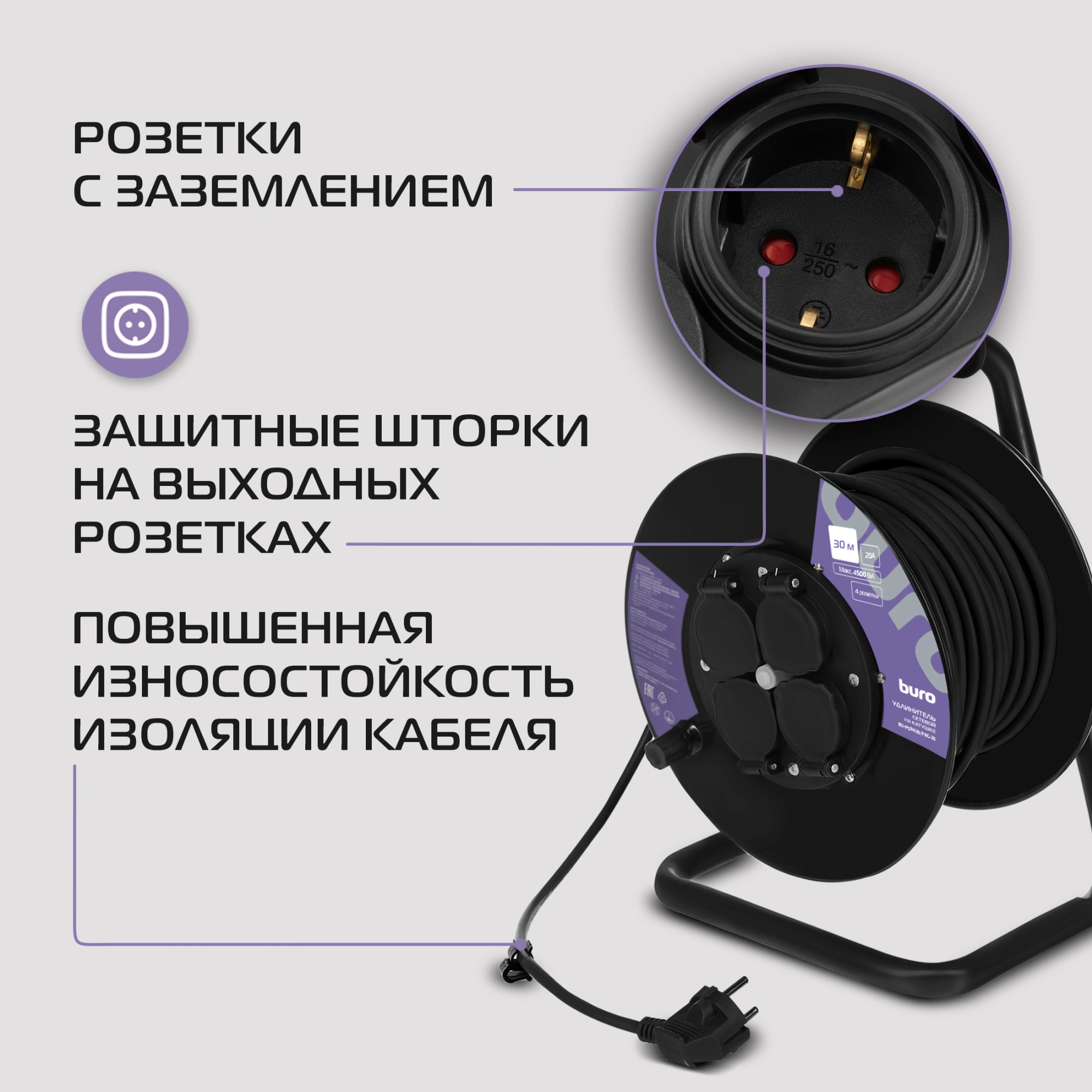 Сетевой удлинитель Buro BU-PSR4.30/FRG-20 30м (4 розетки) черный (коробка) (BU-PSR4.30/FRG-20)